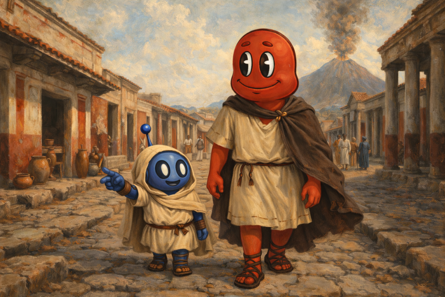 Flynn & Fizz walk the streets of Pompeii with Mount Vesuvius in the background looking oddly eerie. 3rd timeline, 79 AD (Catastrophe Collection)