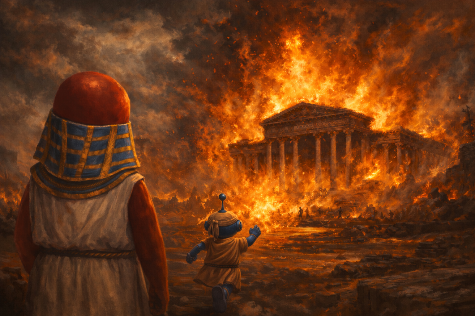 Flynn watches as Fizz sprints toward the fire that destroyed the Library of Alexandria. 3rd timeline, 471 AD (Catastrophe Collection)